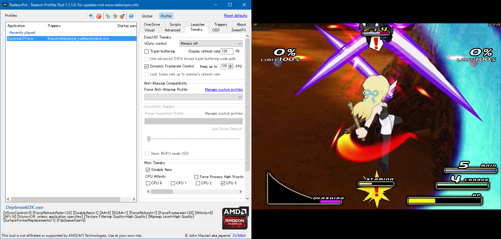 RadeonProを使用すれば120fpsで部活できます。RadeonProを起動したままにしておけば別のランチャーからゲームを起動しても反映はされる様です。 RadeonPro (RADEONのみ) http://www.radeonpro.info/ 1.ツールバーのAdd new profileボタンをクリックしてDaybreakDX.exeを追加 2.ProfilesリストからDaybreakDX.exeを選択して、ツールバーのProfileボタンをクリック 3.Tweaksタブへ移動し、以下のように設定 ・Direct3D Tweaks - VSync control = Always off - Dynamic Framerate Control = 120 FPS |